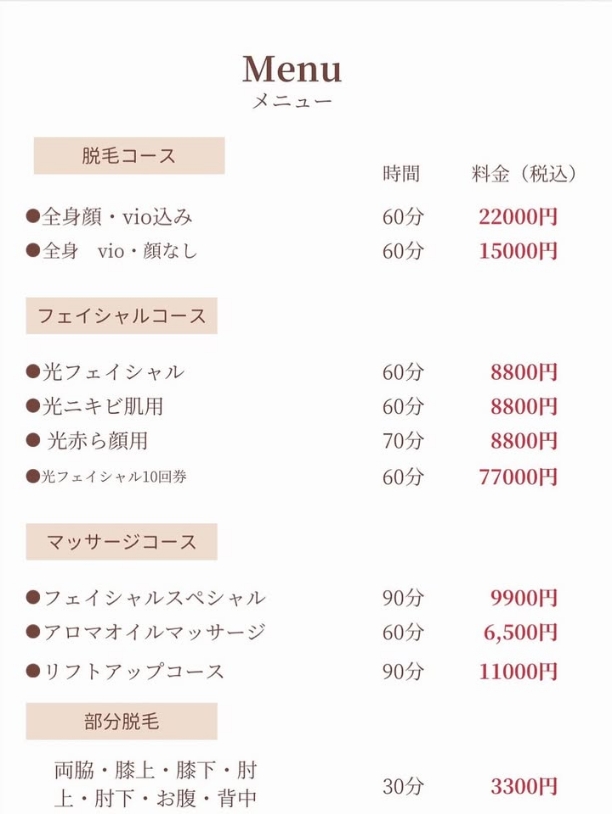 ル・癒しのフェイシャルエステなど幅広いメニューをご用意。